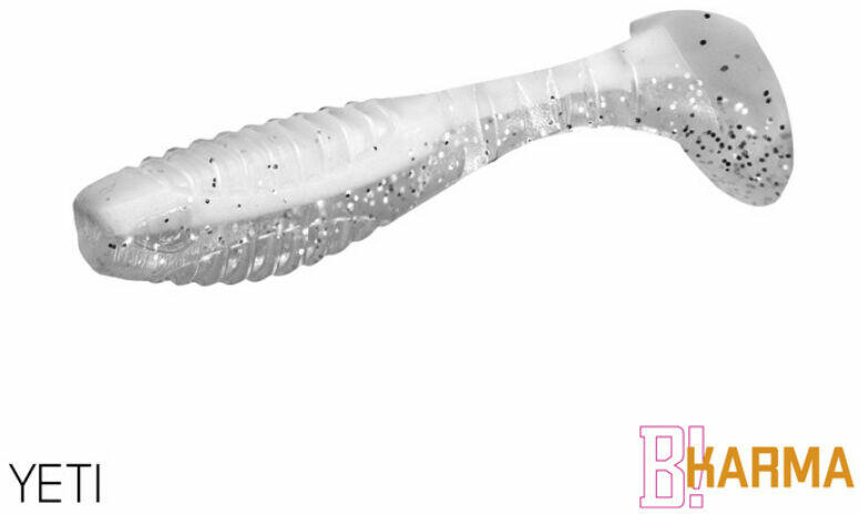 A KARMA modell tervezését kezdettől fogva nem klasszikus megoldásként választottuk a klasszikus modellhez. A cél egy sokrétű felhasználást lehetővé tevő csali megalkotása volt. Első pillantásra észreveheti, hogy a testméret és a csali farok aránya eltér a szokásostól. A csali nagyobb farka a csali atipikus mozgását okozza, ami a farok oszcillációja mellett a test gyengéd forgását is hozzáteszi, ami sérült egyed benyomását kelti. Ez a mozgás rendkívül vonzó a halak számára, és új lehetőségeket kínál a csalival való munka során. A csalitest és a farok csatlakozása között három bevágást modelleznek, amelyek hitelességet adnak a csali mozgásának. A csali teste a háton és a hason rovátkolt. Ennek két oka van. Az első a víz vibrációjának növelése. A második ok az, hogy megkönnyítsük a csali horogra helyezését. A bevágások segítségével pontosan le tudod mérni, hogy a csaliba hova kerül a horog. A jigre való felszúrás így egyszerű. A csali elülső részén a száj területén egy kivágással van módosítva, hogy a csali jobban illeszkedjen a jigfejhez.