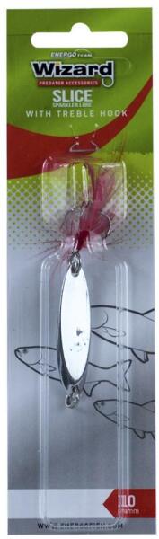Wizard Slice támolygó műlegyes horoggalAz Energo Team Wizard szériája a rablóhalas, illetve a pergetést favorizáló horgászok igényeire nyújt megoldásokat. A legújabb balin és csuka pergetésre szánt csalival sincs ez másképp. A fém támolygó széria a Slice nevet kapta, három féle színben jelent meg, azokon belül is 4 méretskálával. A csali különleges vágott oldalas kialakítású, mely tökéletesen utánozza a sérült táplálékhalakat. Bevontatása az egyéb támolygókéval azonos, lassú tempoban folyamatosan, de akár a lehulló falevél effektus, meg-meg állítva is alkalmazható vele, így inkáb a csukák prédája lesz. Folyamatosan, akár gyorsan vontatva pedig a balinok becserkészésére egyaránt tökéletes opció. A műcsali plusz extra fogósságát növelve, a végén található hármashorog piros színű műléggyel lett szerelve, mely egy plusz ingert nyűjthat, akár kapástalanabb időszakokban is. Ajánlott variáns balinra és csukára, méreteinek köszönhetően, a nagyobb tagokkal váratlan bónuszhalak is horogra akadhatnak a fém csalival.